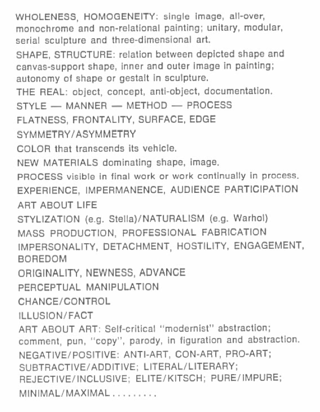 Lucy Lippard’s inventory of conceits in post-Pollock, New York art. From the catalog for “New York 13,” Vancouver Art Gallery, winter 1969.